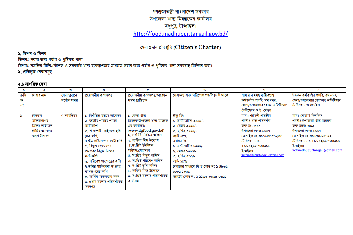 | 1 | চালকল মালিকগণের মিলিং লাইসেন্স প্রাপ্তির আবেদন অগ্রগামীকরণ | 7 কার্যদিবস | 1. নির্ধারিত ফরমে আবেদন 2. জাতীয় পরিচয় পত্রের ফটোকপি 3. পাসপোর্ট সাইজের ছবি (02 কপি) 4.ট্রেড লাইসেন্সের ফটোকপি 5. বিদ্যুৎ সংযোগের প্রমাণক/ বিদ্যুৎ বিলের ফটোকপি 6. পরিবেশ ছাড়পত্রের কপি 7.জমির মালিকানা সংক্রান্ত কাগজপত্রের কপি 8. আর্থিক স্বচ্ছলতার সনদ 9. প্রধান বয়লার পরিদর্শকের সনদপত্র | 1. জেলা খাদ্য নিয়ন্ত্রক/উপজেলা খাদ্য নিয়ন্ত্রক এর কার্যালয়/ [www.dgfood.gov.bd] 2. সংশ্লিষ্ট নির্বাচন অফিস 3. ব্যক্তির নিজ উদ্যোগ ৪.সংশ্লিষ্ট ইউনিয়ন পরিষদ/পৌরসভা ৫. সংশ্লিষ্ট বিদ্যুৎ অফিস ৬. সংশ্লিষ্ট পরিবেশ অফিস ৭. সংশ্লিষ্ট ভূমি অফিস ৮. ব্যক্তির নিজ উদ্যোগে ৯. সংশ্লিষ্ট বয়লার পরিদর্শকের কার্যালয় | ইস্যু ফি: 1. অটোমেটিক 2000/- 2. মেজর 2000/- 3. হাস্কিং 1000/- ভ্যাট 15% নবায়ন ফি: 1. অটোমেটিক 1000/- 2. মেজর 1000/- 3. হাস্কিং 500/- ভ্যাট 15% চালানের মাধ্যমে ফি’র কোড নং 1-4831-0001-1854 ভ্যাটের কোড নং 1-1133-00৩৫-0311 | নাম : শ্যামলী পারভীন পদবীঃ খাদ্য পরিদর্শক কক্ষ নং- 301 উপজেলা কোড-1997 মোবাইল নং-01613616234 টেলিফোন নং-+৮৮০২৯৯৭৭৫৪০১০ ইমেইলঃ ucfmadhupurtangail@gmail.com | নামঃ সোহানা বিলকিস পদবীঃ উপজেলা খাদ্য নিয়ন্ত্রক কক্ষ নম্বরঃ 302 উপজেলা কোড-1997 মোবাইল নং-০১৭১০৮৮০৭০২ টেলিফোন নং-+৮৮০২৯৯৭৭৫৪০১০ ইমেইলঃ ucfmadhupurtangail@gmail.com |